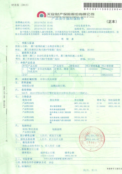 裝備承制單位注冊(cè)證書(shū)-天安保險(xiǎn)單